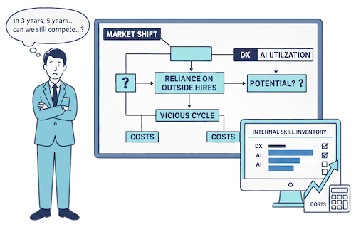 「市場の変化は激しい。3年後、5年後、うちの会社は今の事業・今のスキルのままで戦えているだろうか…」 DX(デジタルトランスフォーメーション)やAI活用を新たな事業の柱にしたいと考えてはいるものの、そもそも社内の誰にその専門知識があり、どの部署にポテンシャルがあるのか全く把握できていませんでした。 結果、外部からの採用に頼るしかなく、コストがかさむばかりか、社内にノウハウが蓄積されないという悪循環に陥っていました。